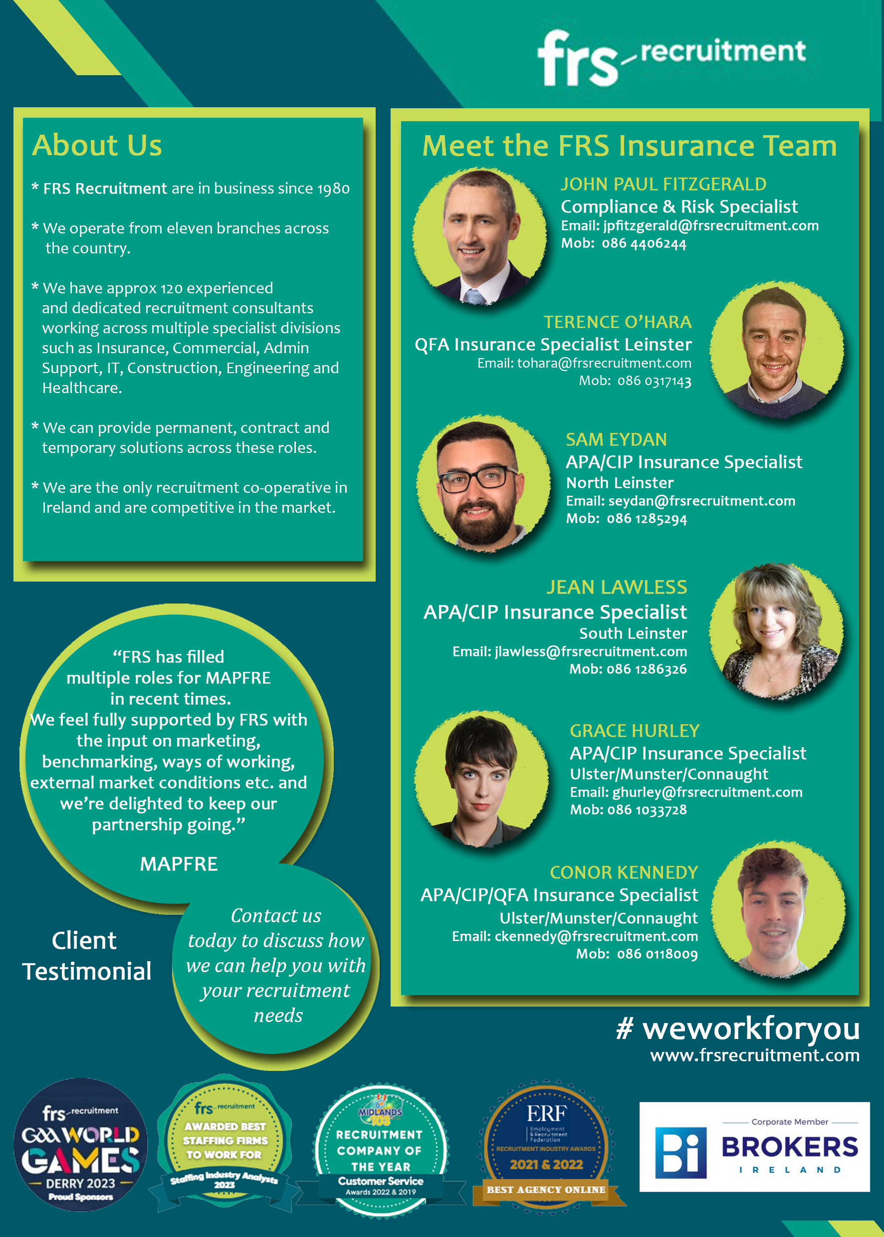 15th June, 2023 – Brokers Ireland, the leading representative body for insurance brokers in Ireland, and FRS Recruitment, a long established, Irish owned Recruitment Agency with 11 offices nationwide and expertise in the financial and insurance sectors, are pleased to announce their new corporate partnership aimed at delivering enhanced recruitment solutions for the insurance industry.