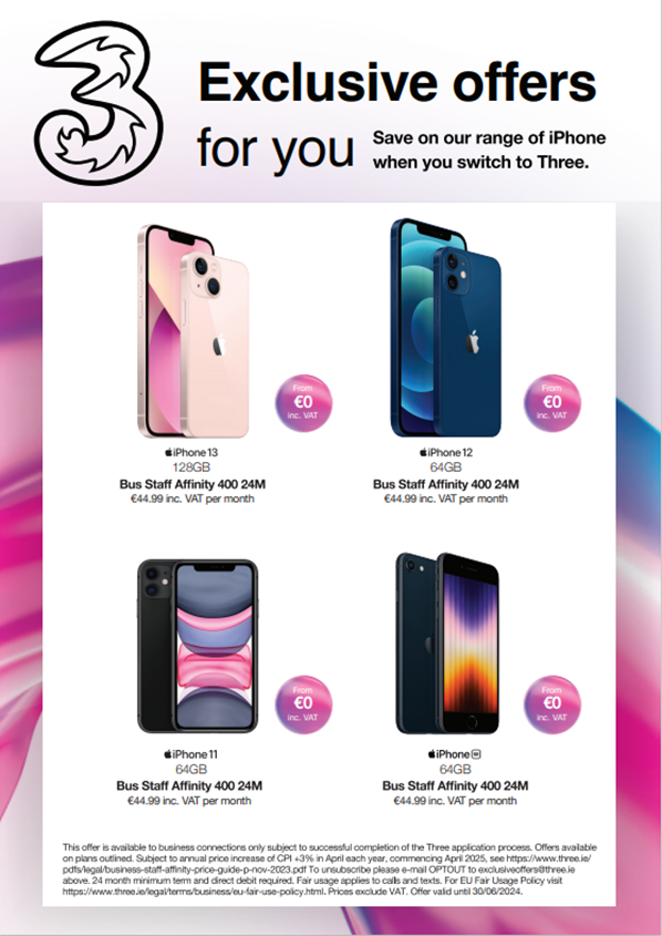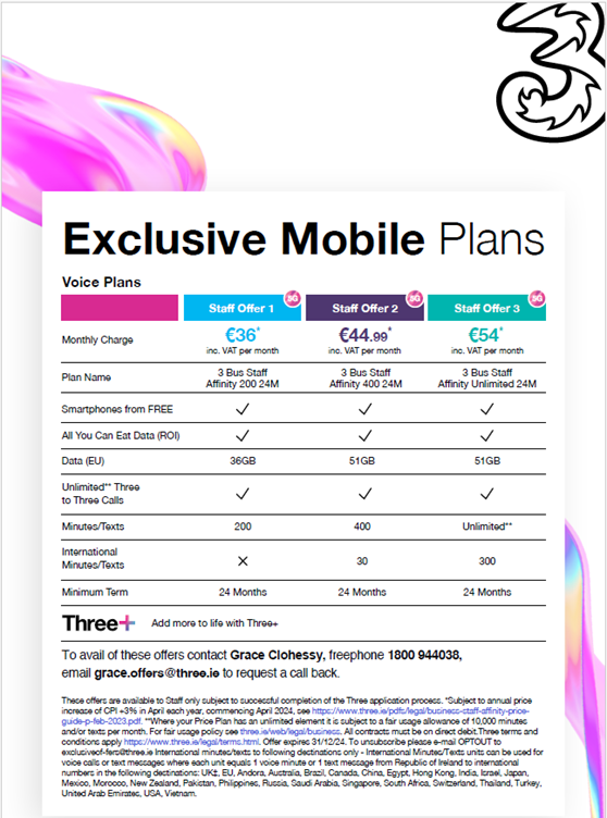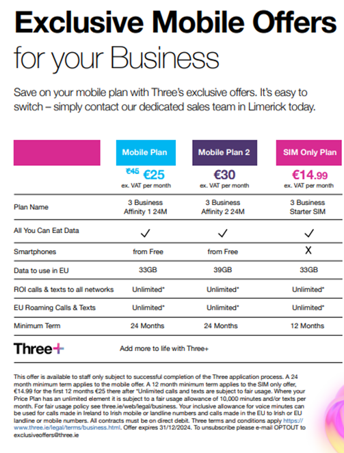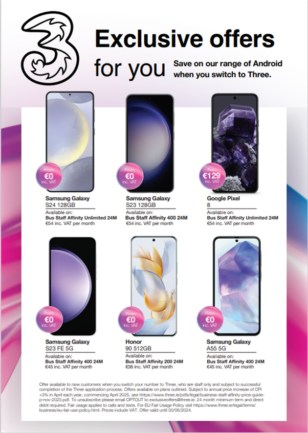 For Phone pricing or General Queries: Freephone 061 203625, E-mail Dylan.business@three.ie