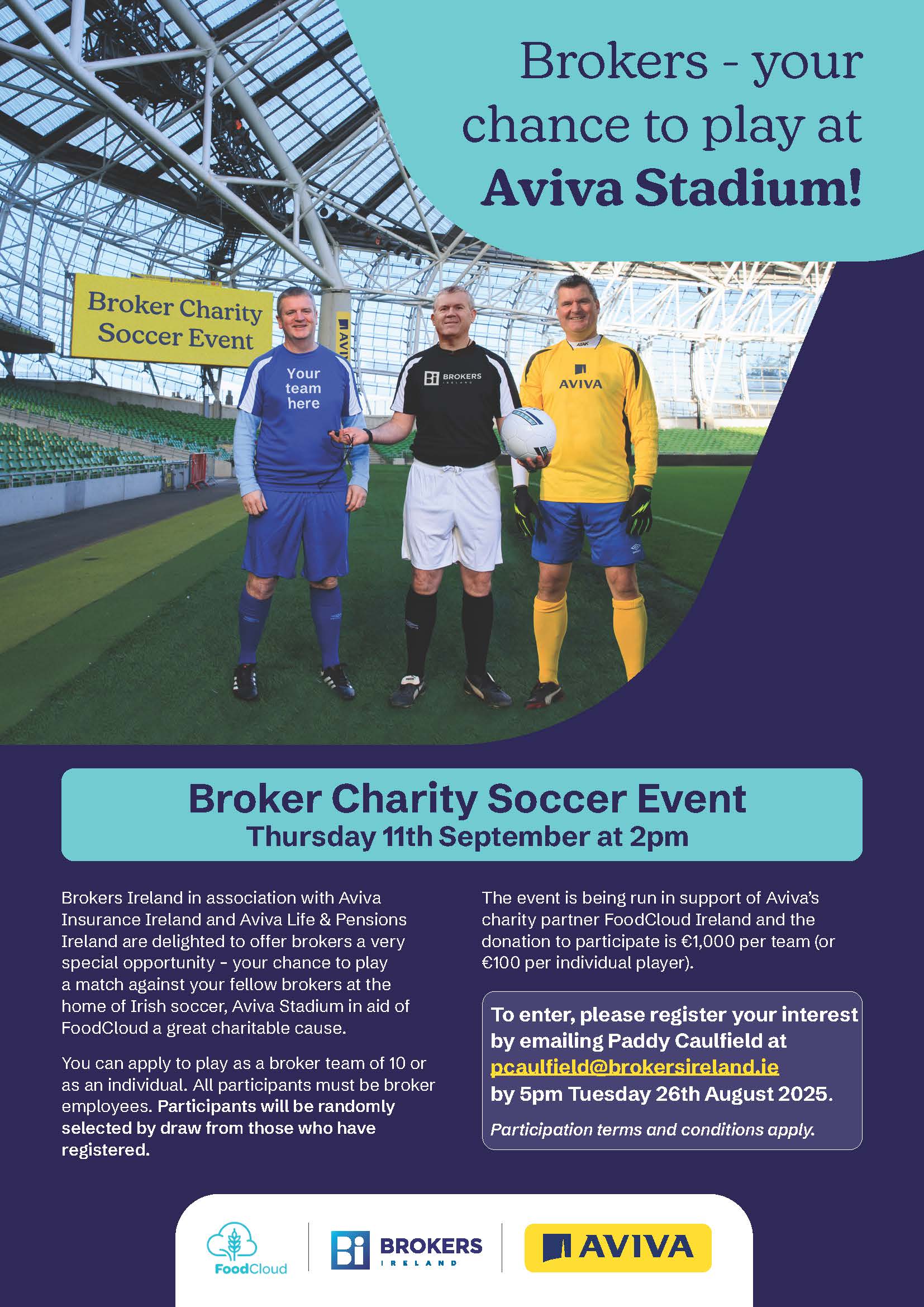 All participants who take part in the Broker Charity Soccer Event must be broker employees. Please register your interest on the button below or for further information, please contact Paddy Caulfield pcaulfield@brokersireland.ie.