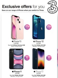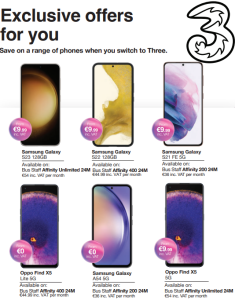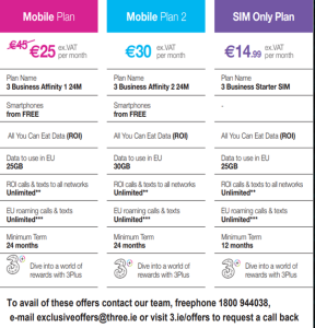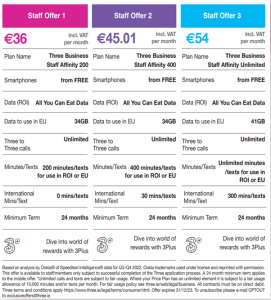 Offer available to new customers when you switch your number to Three, who are staff only and subject to successful completion of the Three application process. Offers available on plans outlined. To unsubscribe please e-mail OPTOUT to exclusiveoffers@three.ie above. 24 month minimum term and direct debit required. Fair usage applies to calls and texts. For EU Fair Usage Policy visit there.ie/legal/ terms/business. Prices include VAT. Offer valid until 30/06/23